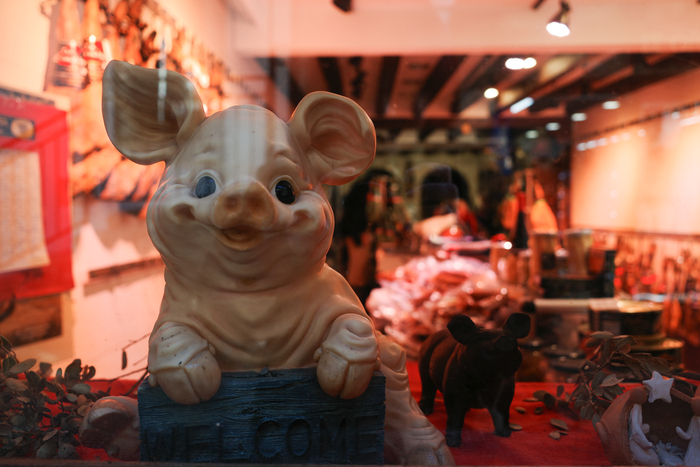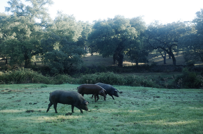 它叫圣·安东猪(Marrano de San Antón),名字源于动物守护神。它皮色黝黑,眼目低垂,佩戴黑/红/绿的耳钉,表明作为伊比利亚猪的血统纯度。