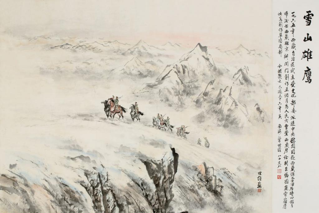 在藏北牧区,梁世雄体验了骑马,一开始骑得很慢,眼看太阳快下山了,他试着加快速度,顺利赶回。从此,他对马很有感情,画了不少马的速写,并抓住了画马的精髓——表现腿部的灵动感。他的主题画作《雪山雄鹰》就是展示藏族民兵骑马巡逻。