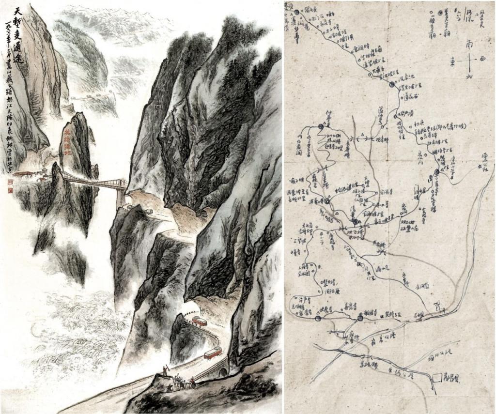 左图:姚耕云《天堑变通途》(画稿),210 cm×145 cm,1966 年。右图: 1965 年姚耕云《手绘路线图》。受访者供图