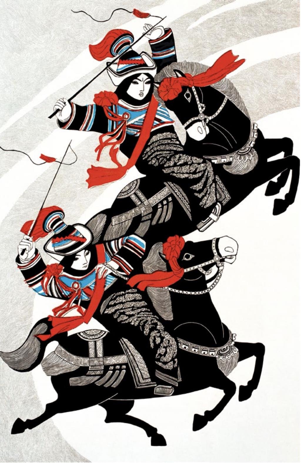 牛文《赛马图》,套色木刻,1985 年。受访者供图