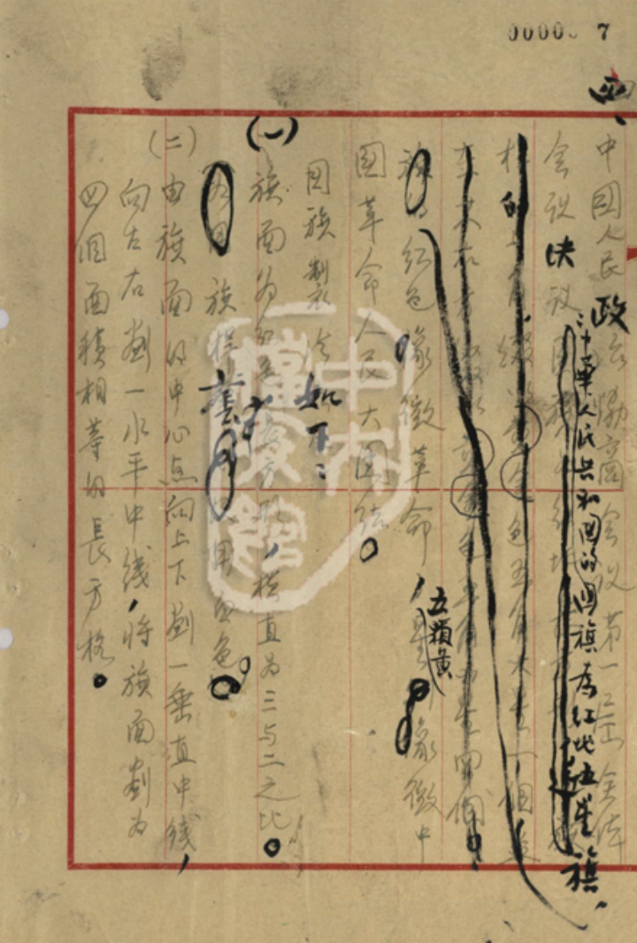 1949年9月27日,中国人民政治协商会议第一届全体会议继续召开,会议通过了《中国人民政治协商会议组织法》《中华人民共和国中央人民政府组织法》和关于国都、纪年、国歌和国旗的四个决议案。大会通过前两个文件后,马叙伦代表方案审查委员会向大会报告方案形成经过,并提交了《四个决议草案》。中央档案馆现存这一草案的手稿。原稿由铅笔写成,经过毛泽东亲笔审改后,排印提交大会。原手稿中写道:“四、中国人民政治协商会议第一届全体会议决议:国旗为红地五星旗。”至此,“红地五星旗”的名称终于正式出现。毛泽东将“国旗为红地五星旗”划去,改写为“中华人民共和国的国旗为红地五星旗”,使其表述更加严谨。在铅笔字手稿中,这句话之后还有一长串文字,由于被毛泽东用毛笔划去,字迹难以一一辨认,但依稀可辨出是关于国旗图案的描述,毛泽东将其删改为“红色象征革命,五颗黄星象征中国革命人民大团结”。毛泽东还修改了国旗制法的部分表述,并添上了《四个决议草案》的大标题。