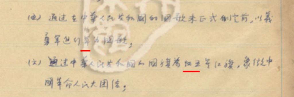 其二,或许是周恩来当日内心过于激动,从录音中可以清晰地听到,他将“义勇军进行曲”误称为“义勇军进行军”。而《第六天大会记录》中,记录者忠实地记录下这个口误,将其记为“通过在中华人民共和国的国歌未正式制定前,以义勇军进行军为国歌”。而且,他并未如听到“五星红旗”一样,当场进行修改。手稿上留下了将“进行军”之“军”字更改为“曲”字的铅笔笔迹,这应是后来核查记录时才发现修改的。