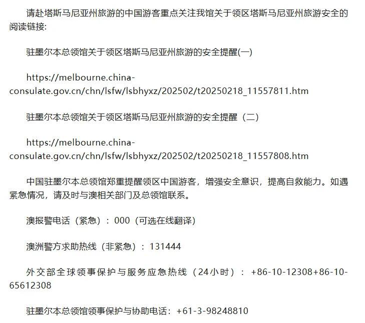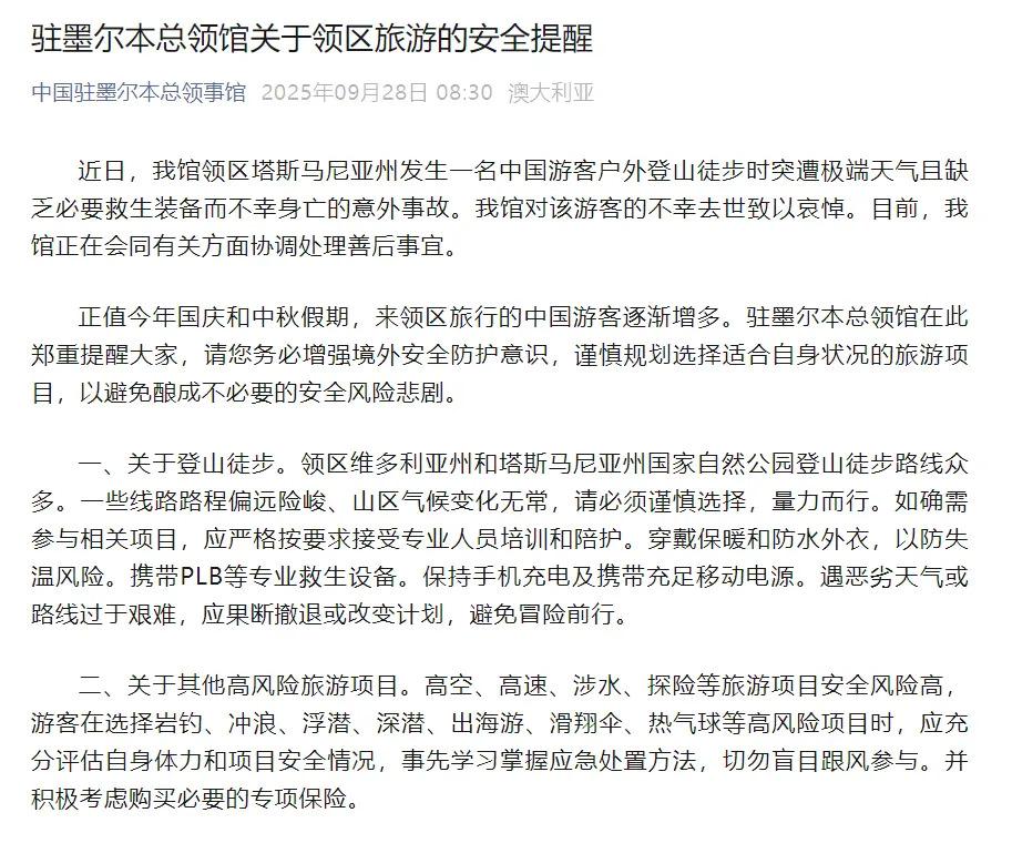 9 月 28 日,据 " 中国驻墨尔本总领事馆 " 官微消息:近日,我馆领区塔斯马尼亚州发生一名中国游客户外登山徒步时突遭极端天气且缺乏必要救生装备而不幸身亡的意外事故。我馆对该游客的不幸去世致以哀悼。目前,我馆正在会同有关方面协调处理善后事宜。