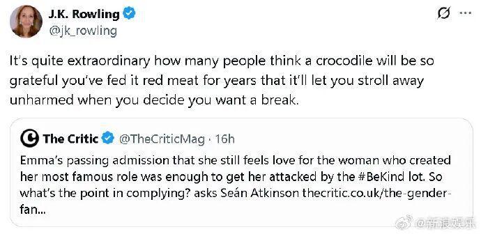 首页 > 综合 J·K·罗琳拒绝与艾玛·沃特森和解 近日,《哈利 · 波特》影版 " 赫敏 " 艾玛 · 沃特森谈及 J · K · 罗琳决裂,并表示很愿意与罗琳展开对话。对此,罗琳先是转发了一段网红恶搞模仿艾玛的视频,之后又转发了一则关于艾玛的评论帖子,她说:" 令人惊讶的是,竟然有这么多人认为,鳄鱼因为你多年来一直喂它红肉而感激,以至于当你决定停暂停喂食时,它会让你安然无恙地走开。"