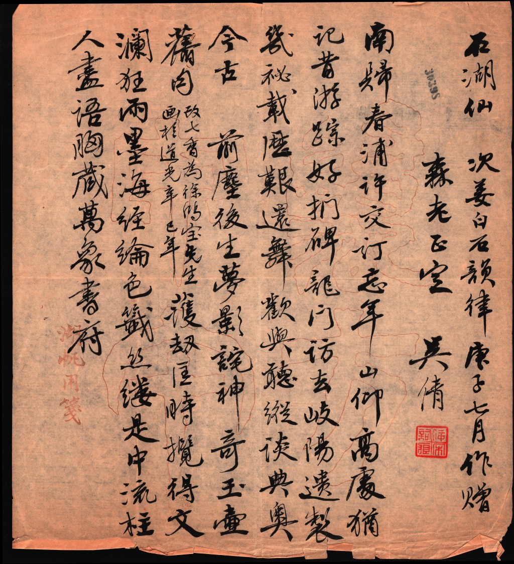 庚子即1960年,此年2月,徐森玉被国务院聘任为中央文史研究馆副馆长,而农历七月则是徐先生八十大寿之期。此词的副题云“次姜白石韵律”,事实上《石湖仙》这个词牌,正是姜夔首制,是为了向友人范成大祝寿而作。也就是说,吴湖帆这首《石湖仙》词,就是特意写给徐森玉的祝寿词。在该阕词的其他版本中,有作《石湖仙·寿森老八十用姜白石韵律》,有作《石湖仙·次白石韵律赠徐森老八十寿》的,也可证明这一点。