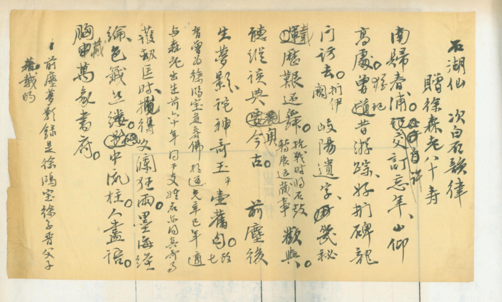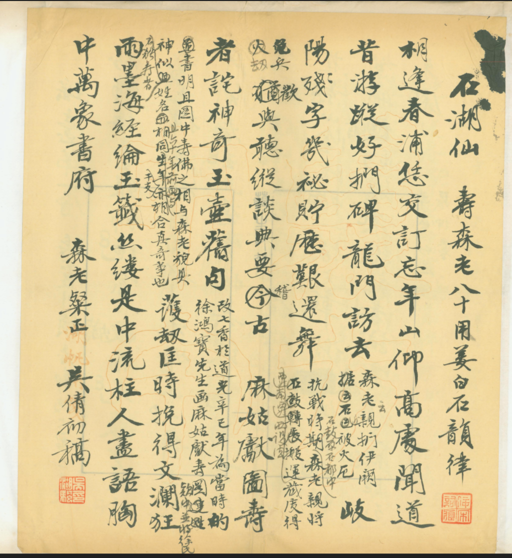 A版已见前引。B版即《石湖仙·寿森老八十用姜白石韵律》,其文作:“相逢春浦。恁交订忘年,山仰高处。闻道昔游踪,好扪碑、龙门访去(森老云亲扪伊阙,石近被火厄)。岐阳残字,几秘贮、历艰还舞(抗战时期,石鼓在都中。森老亲将搬运,迁南迁西,设法藏庋,得免兵劫)。欢与。听纵谈、典要稽古。 前麻姑献图寿者,诧神奇、玉壶旧句(改七香于道光辛巳年为当时的徐鸿宝先生画《麻姑献寿图》,款中并将徐氏书明。且图中寿佛之相,与森老貌具神似,不独寿者姓名相同。且六十年前画,与生年干支亦相合,真奇事也)。护劫匡时,揽得文澜狂雨。墨海经纶,玉签丝缕。是中流柱。人尽语。胸中万象书府。森老粲正。吴倩初稿。”前钤“佞宋词痕”小朱方,后钤“吴印湖颿”小白方。C版即《石湖仙·次白石韵律赠徐森老八十寿》,其文作:“南归春浦。许交订忘年,山仰高处。犹记昔游踪,好扪碑、龙门访去(扪伊阙)。岐阳遗字,几秘载、历艰还舞(抗战时,将石鼓转展运藏事)。欢与。听纵谈、典奥今古。 前尘后生梦影,诧神奇、玉(平)壶旧句(改七香曾为徐鸿宝先生画寿佛于道光辛巳年,适与森老出生前六十年同干支。姓名亦同,真奇事)。护劫匡时,揽得文澜狂雨。墨海经纶,色签丝缕。是中流柱。人尽语。胸藏万象书府。”又旁注云:“《前尘梦影录》是徐鸿宝、徐子晋父子著载的。”这三版文字相较,C版、A版显而易见是一脉相承的。而B版则异文较多,且注释更多。另外值得一提的是,A、B两版皆书于吴湖帆自制笺纸之上,笺纸正中为自行双钩《天发神谶碑》中“万方甲午”四字,左下则为“湖帆用笺”四字。故吴信中所言“是当你《天发碑》一样”,实在不是空作比喻,而是确是竭尽巧思的。C版则书于普通宣纸之上,显然为自留底稿。又B版虽存上下款,且格式精严,书写庄重,但多存后来毛笔、铅笔修改之处。C版较为随意,且多文字改动。而A版则一丝不苟,惟恭惟谨。由此可以推断,B版本即吴湖帆呈送森老原本,不料森老因此动怒。吴湖帆遂就此本,续有所改。D版就是在B版修改本基础上的再改本,并以此为基准,又改作为C版,并在C版基础上,重新写定为A版,再次呈送森老。其实,在这四个版本之外,还有一个版本,就是上海图书馆所藏《佞宋词痕》中所录,写于专门的“佞宋词痕”稿纸之上者,是最终定本。而此本正文,与写给徐森老的词的正文毫无二致。区别则在于,词题中仍作“次姜白石韵寿徐森老八十”,注释还在强调改琦所写图之时间与森老生年干支皆同,而在写给森老的那一版中,则不再提及此事。可见,森老对此类涉及他生辰的相关信息,都很是反感。如前所述,在给森老的A版中,与生辰的相关信息都被删去。至于C版中的注释,所以删去,则是因为其中有误。据《心太平轩医案》黄寿南抄本后署“男珊编次,孙酚再校,康校正,曾孙元亮子瑜甫刊”,结合徐康跋中所言,知徐康之祖父为徐锦、父为徐珊,与其叔父三人都是行医为生,与徐鸿宝并无关系。区区一首词而已,已有如此多之版本,背后又有着如此多的故实可待发覆,可见文献整理之价值与难度,更可见吴湖帆本人对于文献价值认知之深厚以及其将文献保存完好之可贵。