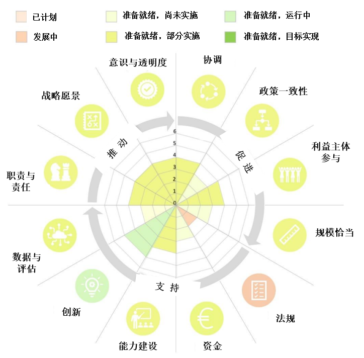 2023年10月,斯特拉斯堡大都市区的经济发展部门基于经合组织的城市和区域循环经济治理得分卡(OECD Scoreboard)进行了自我评估,识别出本区域循环经济转型中存在的多项挑战,尤其是在法规、政策、融资、数据等得分较低的领域(图2)。斯特拉斯堡应发挥推动、促进和支持三个维度的作用,加速推进循环经济转型进程。