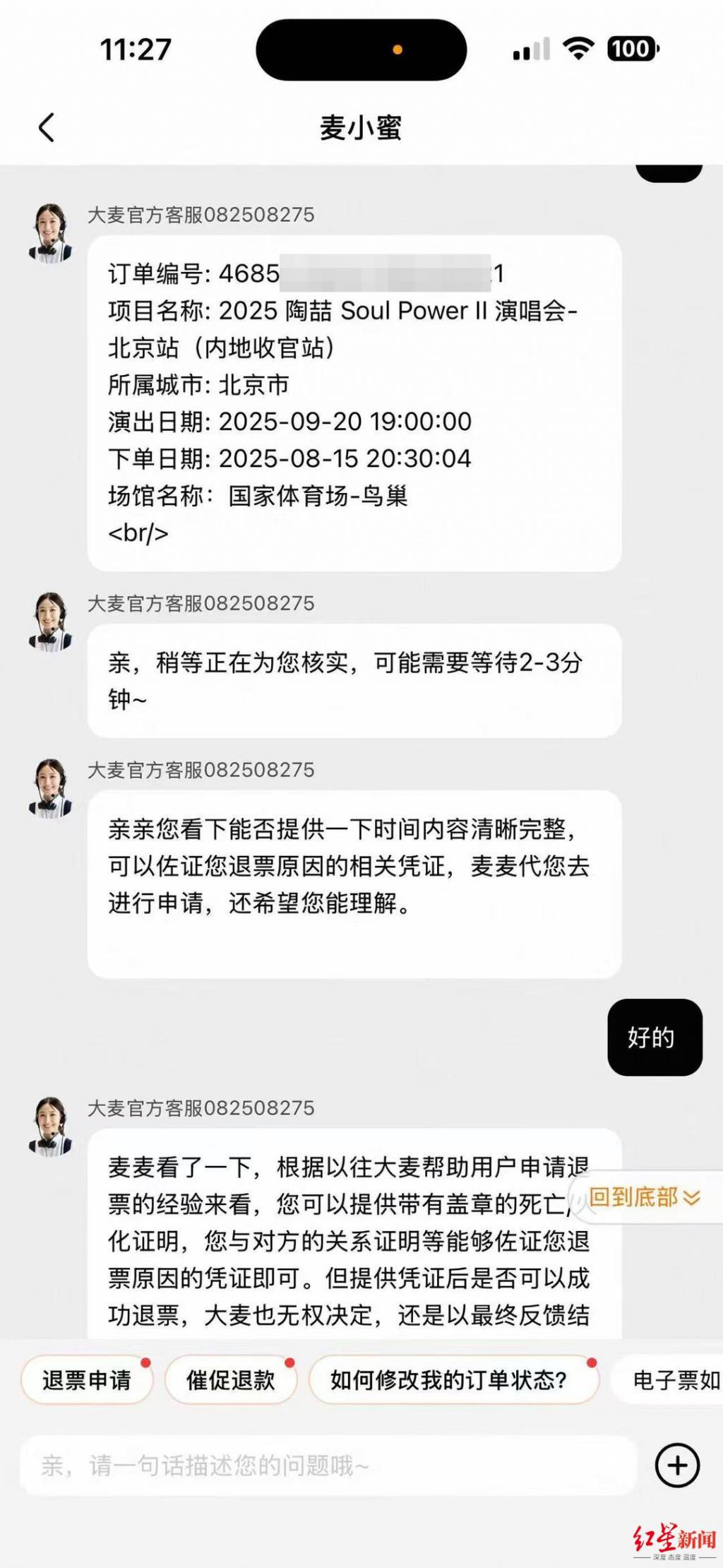 罗女士称,9 月 24 日,客服告知她可退款 80%。罗女士则要求退全款,一是她这个情况是不可抗力,网上查询有退全款的;二来她觉得大麦网让其提供了这么多材料,来证明 " 外公是外公 ",她的时间成本和精神状态都受到影响。到了 9 月 28 日上午,大麦网的客服又电话告知她不退票了。
