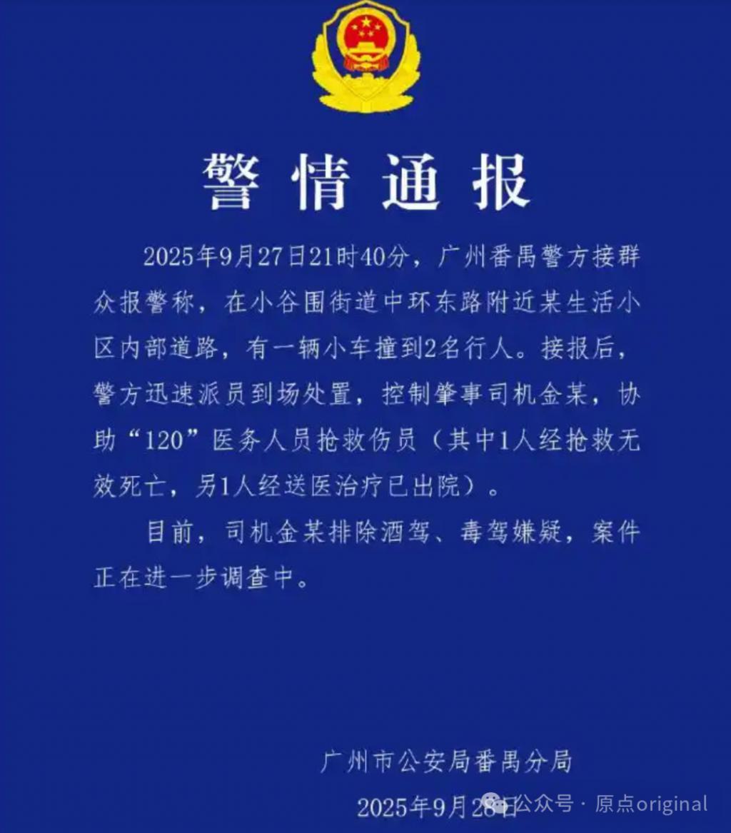 不久后,刘澍便在网络上看到警情通报:9 月 27 日 21 时 40 分,在广州中环东路附近某生活小区内部道路,有一辆小车撞到 2 名行人,其中 1 人经抢救无效死亡,另 1 人经治疗后出院。案件正在进一步调查中,肇事司机金某排除酒驾、毒驾嫌疑。