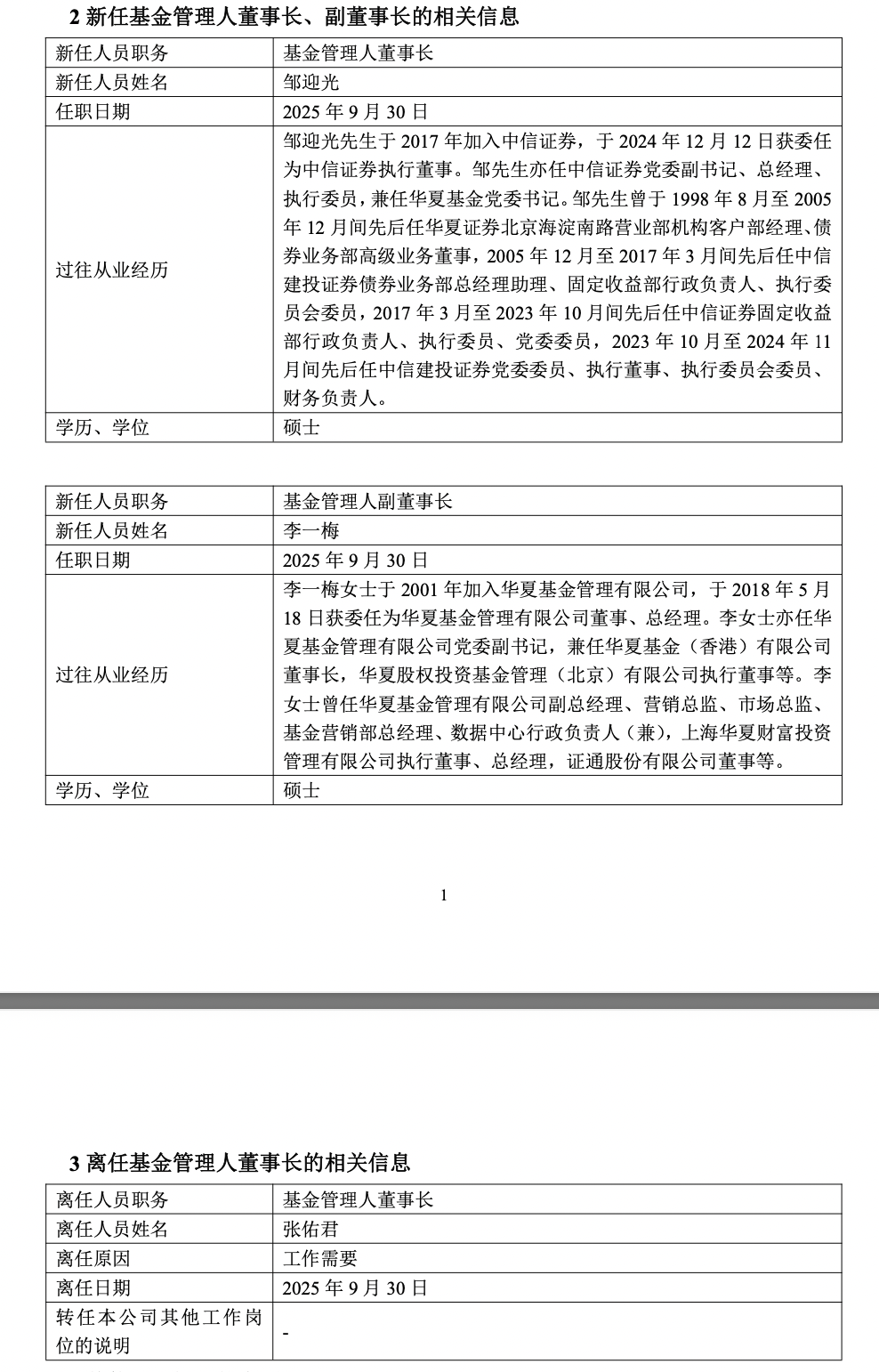 9月30日晚间,华夏基金公告称,新任邹迎光为董事长、李一梅为副董事长,任职日期为9月30日;原董事长张佑君因工作需要离任。