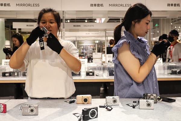 9 月 6 日,北京一家大型二手交易平台的线下商店内,两名年轻人正在选购二手 CCD 相机(一种使用电荷耦合器件作为图像传感器的数码相机)。近年来,此类复古相机正在重新受到关注,成为年轻人们记录生活的 " 新宠 "。姚沐含 / 摄