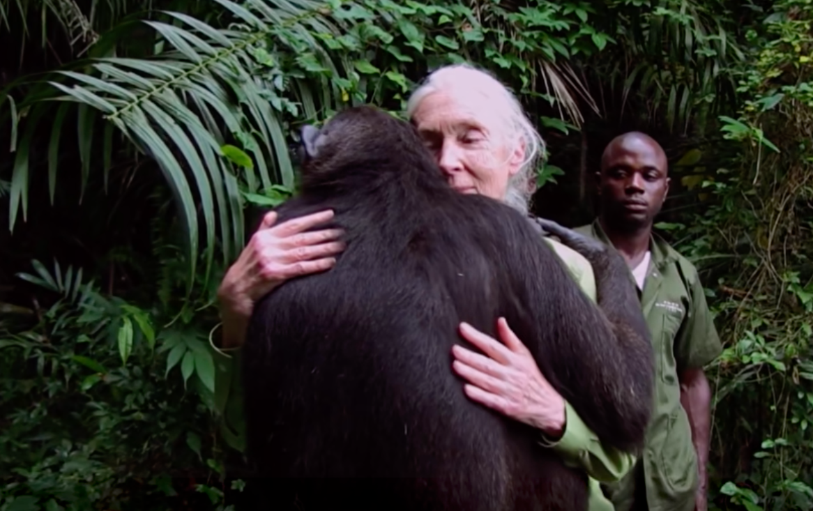 被救助的黑猩猩在放归前拥抱珍·古道尔