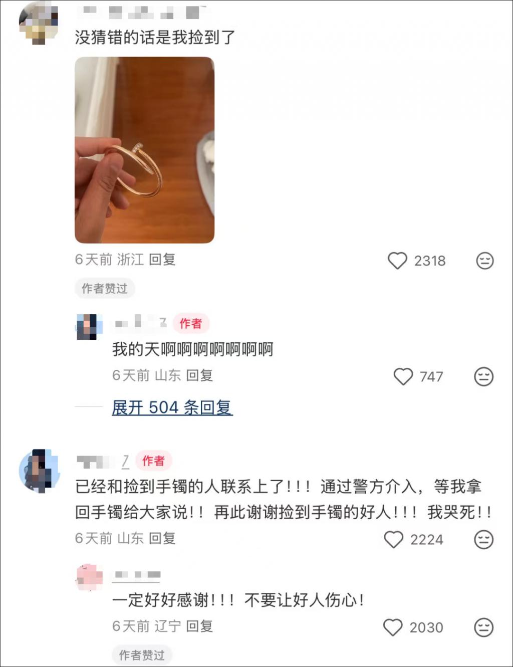 没想到第二天,奇迹真的在评论区出现,坐标浙江的网友回复并晒图:" 没猜错的话是我捡到了。"随后,周女士称已经和捡到手镯的人联系上了,并请警方介入。