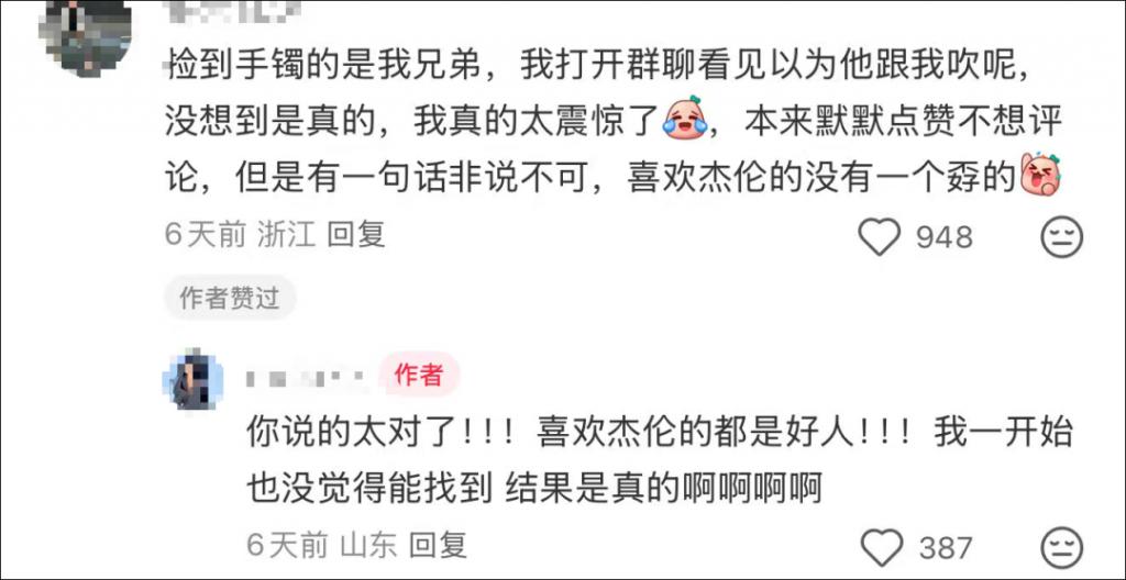 有网友在评论区说:" 捡到手镯的是我兄弟,我打开群聊看见以为他跟我吹呢,没想到是真的,我真的太震惊了,本来默默点赞不想评论,但是有一句话非说不可,喜欢杰伦的没有一个孬的。"