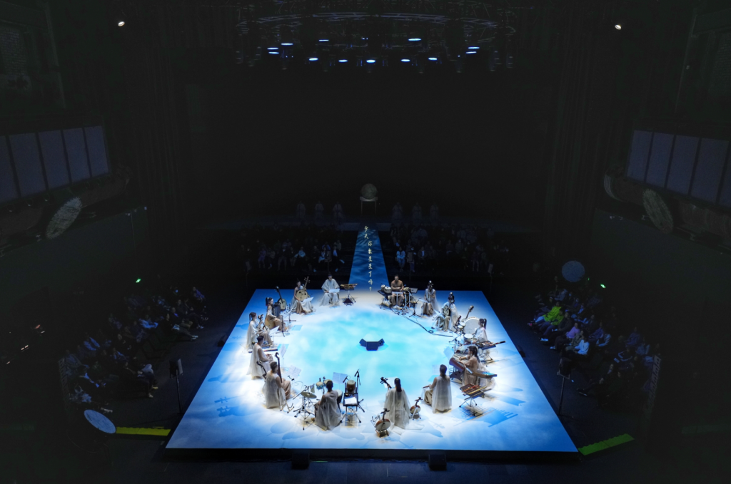 白色方形舞台上,14位演奏家围坐一圈,构建出一个独特的圆形声场。观众围坐在舞台四周,和演奏家们一步之遥,呼吸相闻。