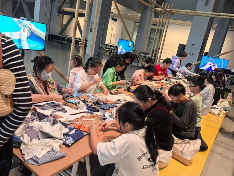 长假期间,上海当代艺术博物馆《美术馆里的月光》中,参观者正在体验布艺非遗