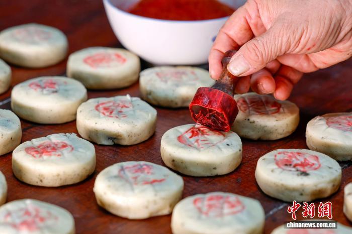 资料图:图为制饼手艺人将“徽式麻仁月饼”盖印。施亚磊 摄