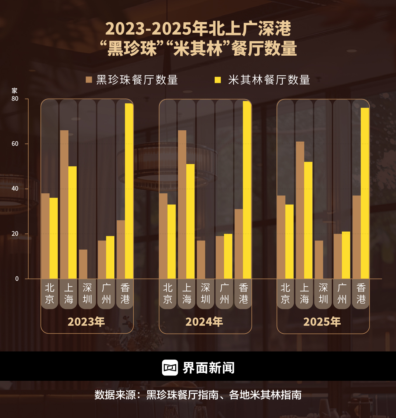 界面新闻综合黑珍珠与米其林2025年榜单统计发现,就城市格局而言,精致餐厅呈现一线主导与二线崛起并存的现状。上海、北京、香港稳居双榜核心地位,但在其中,各个城市的精致餐饮源头、布局、发展又各有不同。