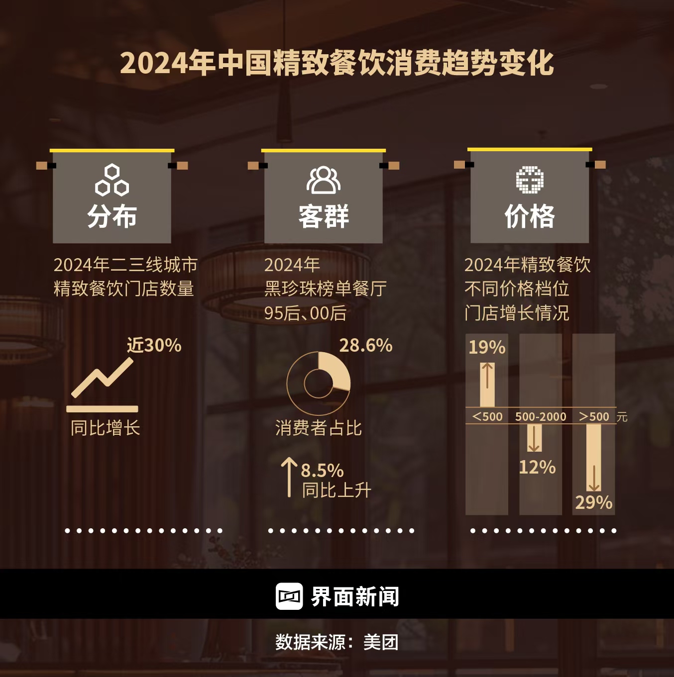 美团餐饮数据显示,2024年精致餐饮在500以下档位的门店数量提升了19%,500-2000元档位门店数量下降12%,2000元以上档位门店减少29%。