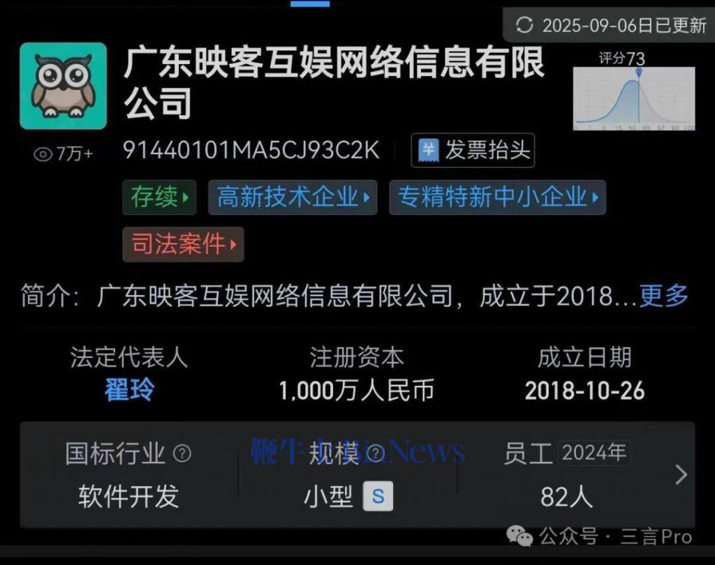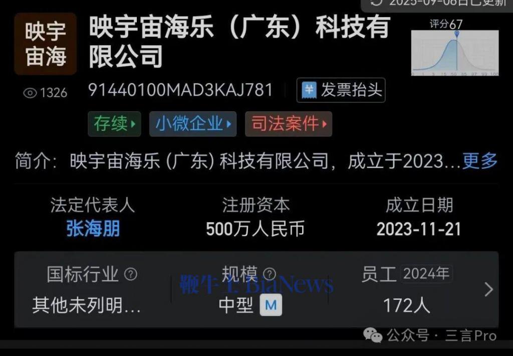 映宇宙海乐(广东)科技有限公司成立于 2023 年 11 月,注册资本 500 万元人民币;由 Inke HongKong Limited 全资持股。
