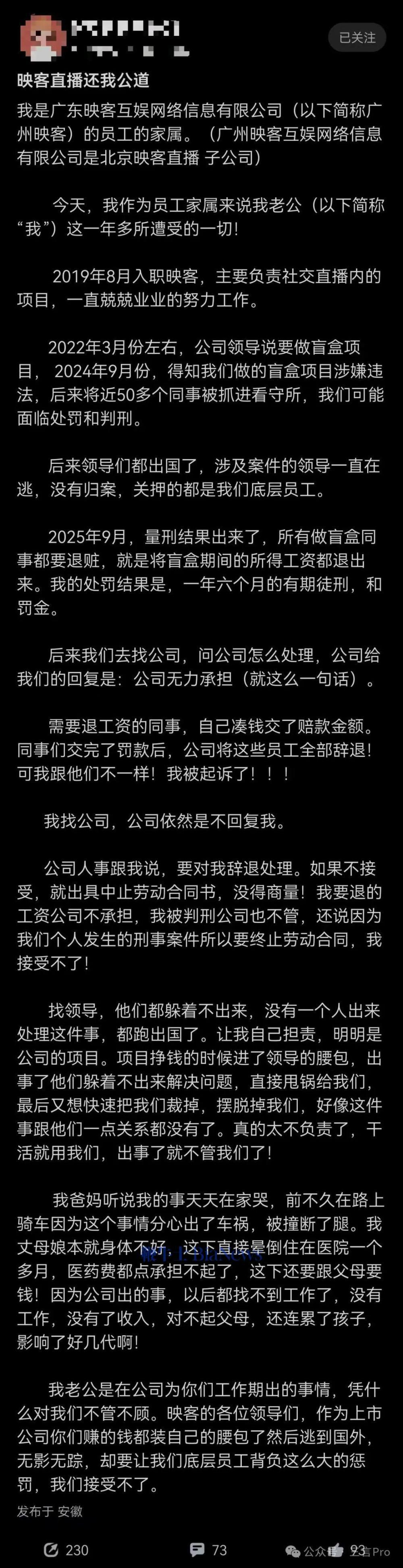近日,一位自称是映客公司一名员工家属的网友爆料称,自己丈夫在映客工作期间,在领导要求下参与违法的盲盒项目,导致其被判一年半有期徒刑,且需退还违法项目期间所有工资。