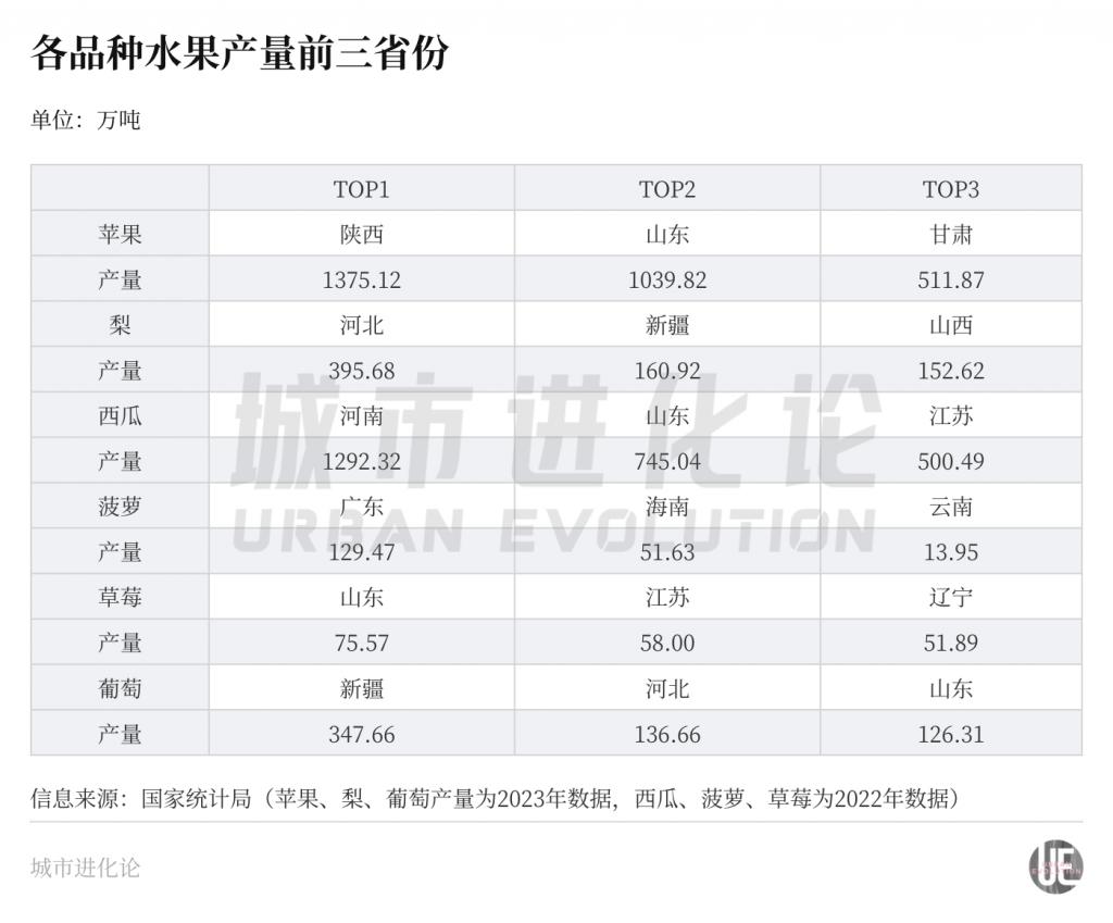 比如,苹果产量,陕西和山东占据前两位,洛川富士和烟台红富士 " 排面 " 十足;梨产量,拥有赵县雪花梨的河北和孕育出库尔勒香梨的新疆则无人能敌。还有河南的西瓜、广东的菠萝、山东的草莓、新疆的葡萄,每一种水果都代表了一种城市的味道,也串联起人们有关地区的记忆。