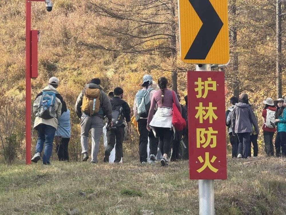 当时我们已经驶过了景区大门,门口有穿着黄绿色反光背心的工作人员和一位身着橘色服装的消防员,向每一辆车发放 " 禁止携带火种 " 的提示。