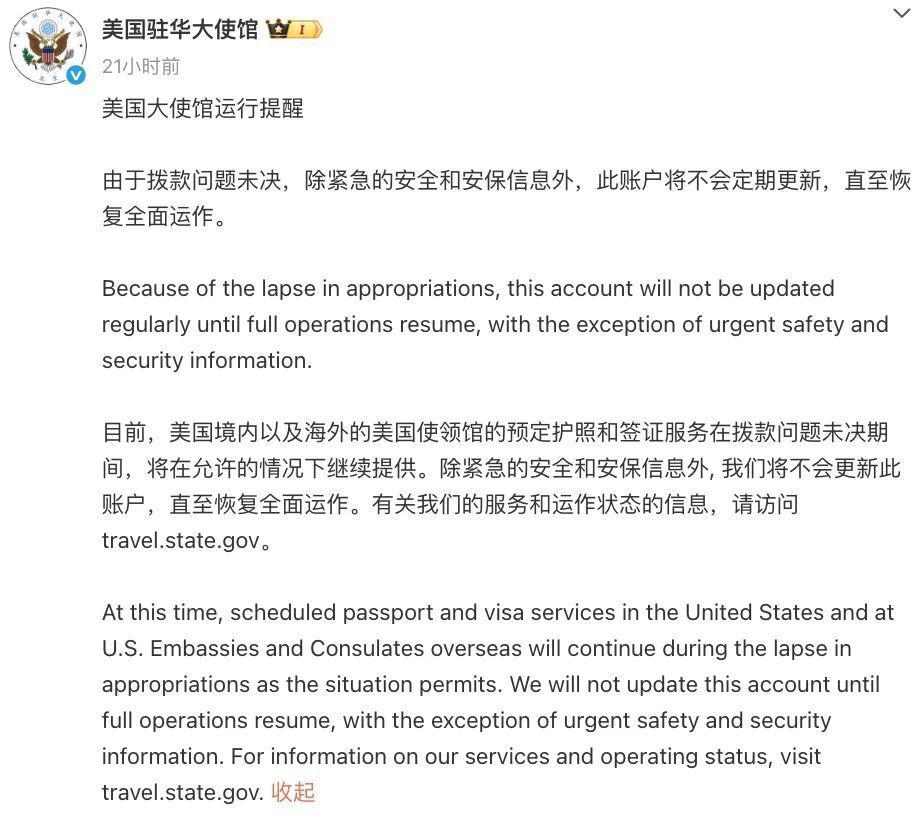 目前,美国境内以及海外的美国使领馆的预定护照和签证服务在拨款问题未决期间,将在允许的情况下继续提供。除紧急的安全和安保信息外 , 我们将不会更新此账户,直至恢复全面运作。
