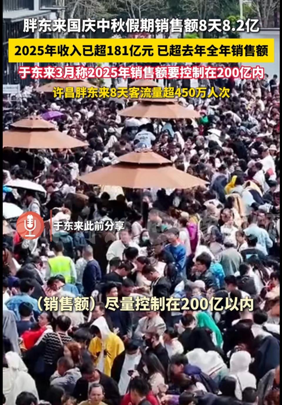 首页 > 综合 8天8.2亿!胖东来国庆中秋假期销售额公布,今年已收入180亿元,超去年全年 大河报 · 豫视频记者 梁奇慧10 月 9 日,许昌胖东来商贸集团公布最新销售数据,截至 10 月 8 日,2025 年胖东来本月度销售额已达 8.2 亿元,2025 年收入已超 181 亿元,超去年全年销售额。据悉,胖东来 2024 年销售额为 169 亿元。今年 3 月,于东来曾在一次活动上分享称要把胖东来的销售额控制在 200 亿之内。