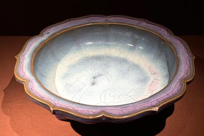 展览中,一件北宋钧窑玫瑰紫釉菱花式花盆托格外引人注目。