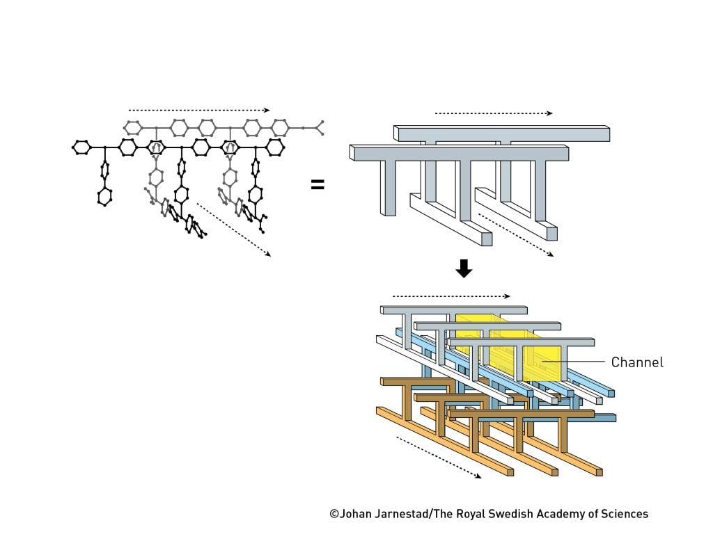 1997 年,日本的北川进团队将钴、镍或锌离子与名为 4,4′- 联吡啶的分子,创造出三维金属有机框架。晶体层之间呈古建筑的 " 榫卯 " 式嵌合(tongue-and-groove)。©Johan Jarnestad/ 瑞典皇家科学院
