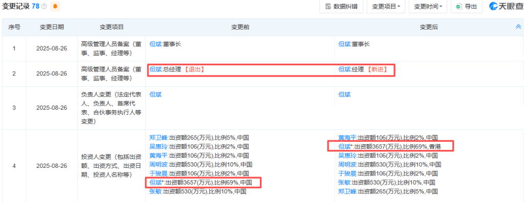 天眼查显示,今年8月26日,东方港湾变更了投资人、高级管理人员等相关信息,但斌的身份从中国内地居民变为中国香港居民,同时,但斌卸任东方港湾总经理,改为经理头衔,并继续担任公司董事长。