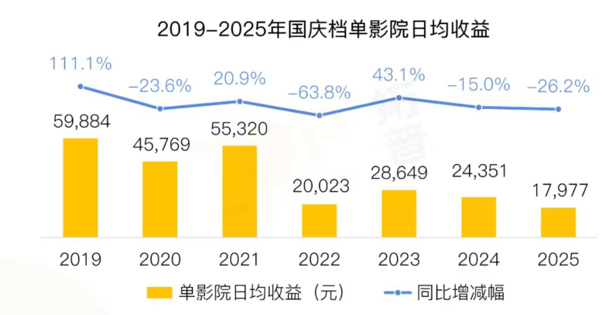 影院经理绞尽脑汁纵横排片策略,使得今年国庆档的放映场次再度创下新高,达到365.63万场,同比增长15.35%,但对应上下滑的总票房,不难感知到,场均收益与单影院收益受到巨大挑战。拓普数据显示,2025年国庆档单影院日均收益仅17977元,同比下滑26.2%,甚至低于档期票房更差的2022年。
