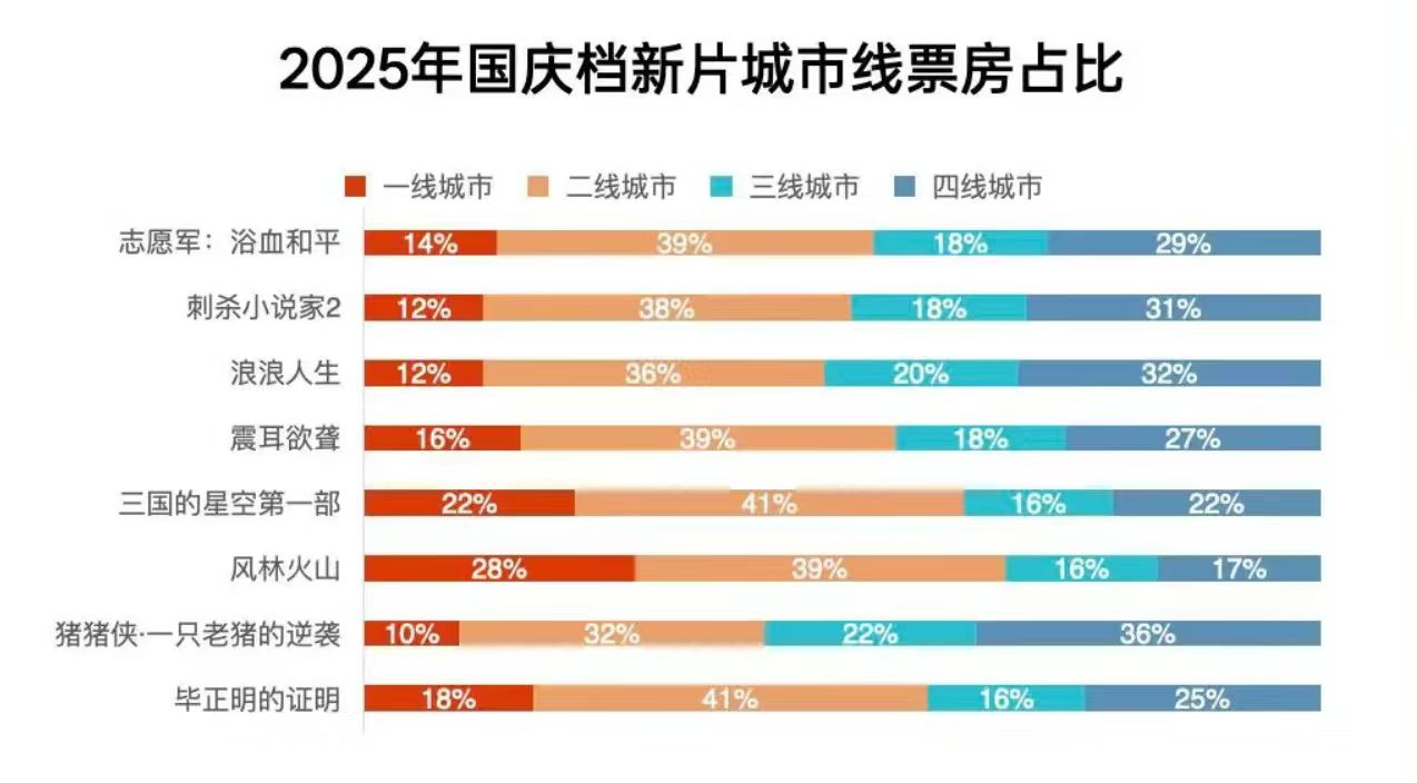 据猫眼数据,2025年国庆档一线城市票房占比仅为13%,为近五年最低,而三四线城市票房占比则高达49%。其中,一线城市票房占比最高的影片为《风林火山》《三国的星空 第一部》,这两部影片的票房是国庆档上映新片的倒数第三与第四。