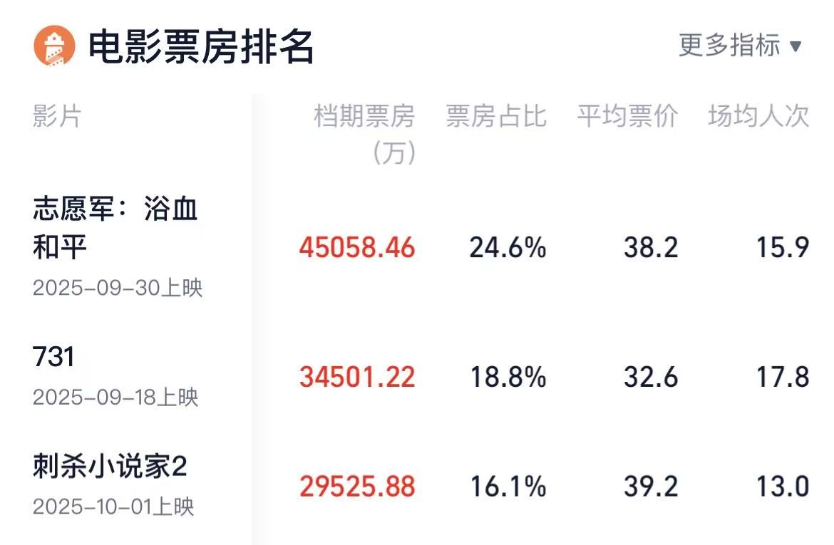 不过,《731》目前在猫眼、灯塔平台的预测票房仍未突破20亿,其在档期内也仅收获接近3.5亿的成绩,与往年的爆款影片对比相去甚远。此番尴尬的情况在于,存量与增量观众之间,并未在这个国庆档达成统一,导致票房分布相对均匀,没有“赢家通吃”的情况出现。