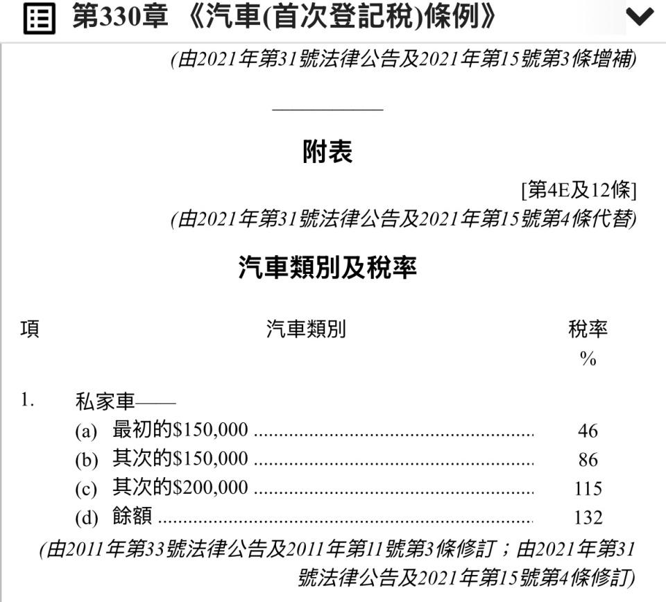 而高昂的税费也是购车压力的主要因素。在香港购车,需要缴纳首次登记税。根据香港现行规定,首次登记税按车辆应课税价值(即税前车价)梯度征收:15 万港元以内的部分需缴纳 46% 的税率,15 万至 30 万港元的部分税率升至 86%,超过 30 万港元的部分税率进一步提高到 115%,若车辆应课税价值超过 50 万港元,对应的税率更是高达 132%。