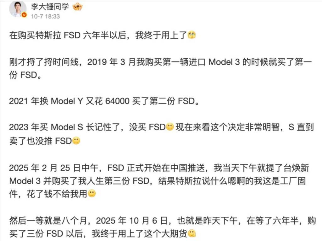 就目前来看,特斯拉 FSD V14.1 仅面向北美用户。但值得关注的是,据博主 @李大锤同学透露,在连续购买三份 FSD 后,他今年 2 月提车的 Model 3 于 10 月 6 日终于通过升级至 V13.2.9 版本成功启用 FSD,实测功能完全可用。