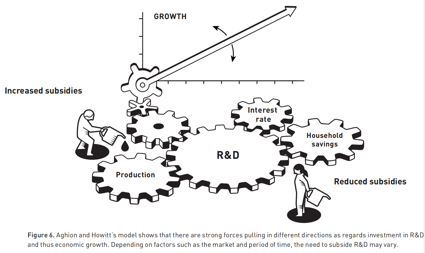 阿吉翁和豪伊特的模型表明,在研发投资和经济增长方面,存在着不同方向的强大力量。根据市场和时间等因素,对研发的补贴需求可能会有所不同。