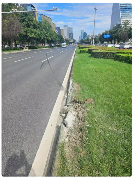 事故画面太过惨烈不放原,只放一个今早网友拍摄的事故现场,粉碎的路牙子大概率就是导致起火自燃的原因。图自网友