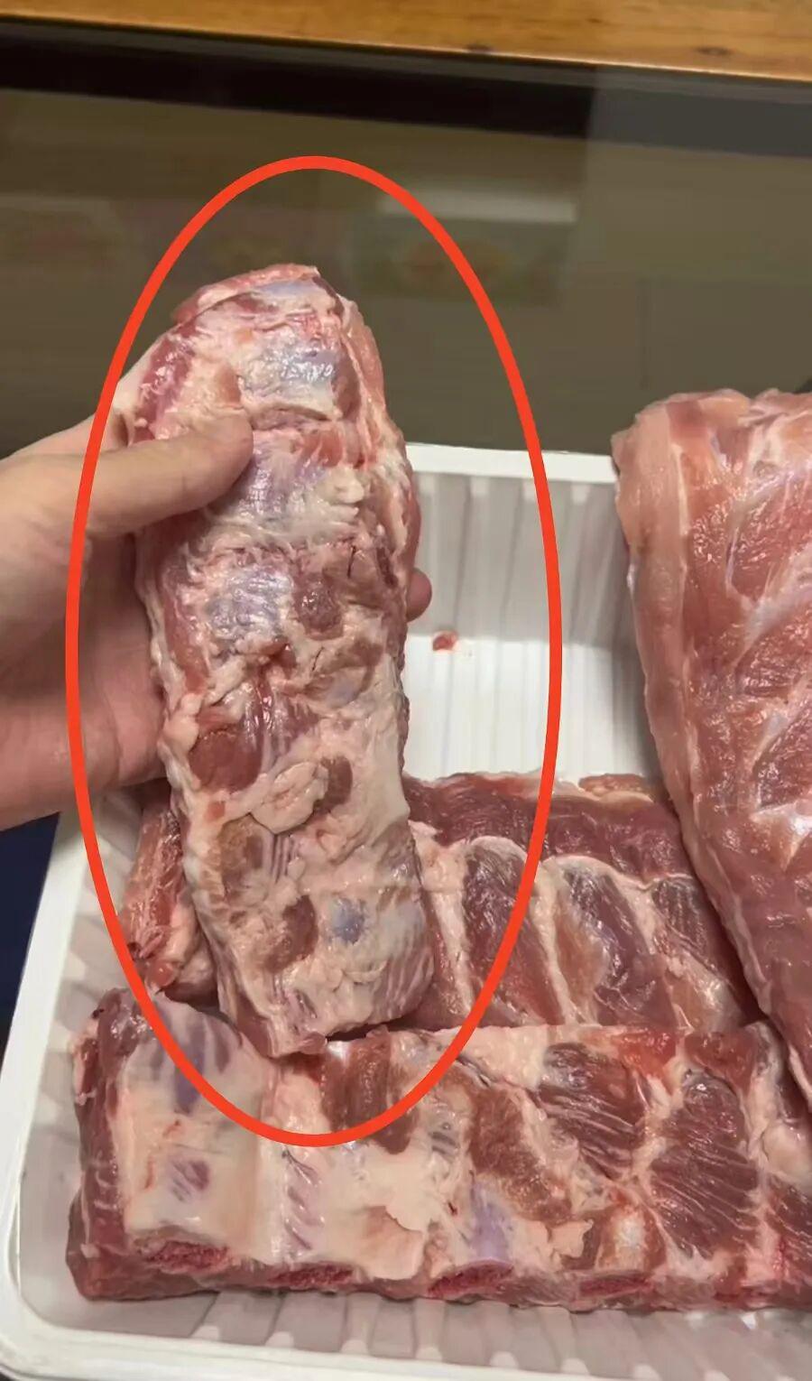王先生表示,一份猪肋排一共 4 块,他在分装时发现其中一块的颜色较深," 拿起来闻了一下,一股恶臭。" 王先生说,当时就被那股异味恶心到了。