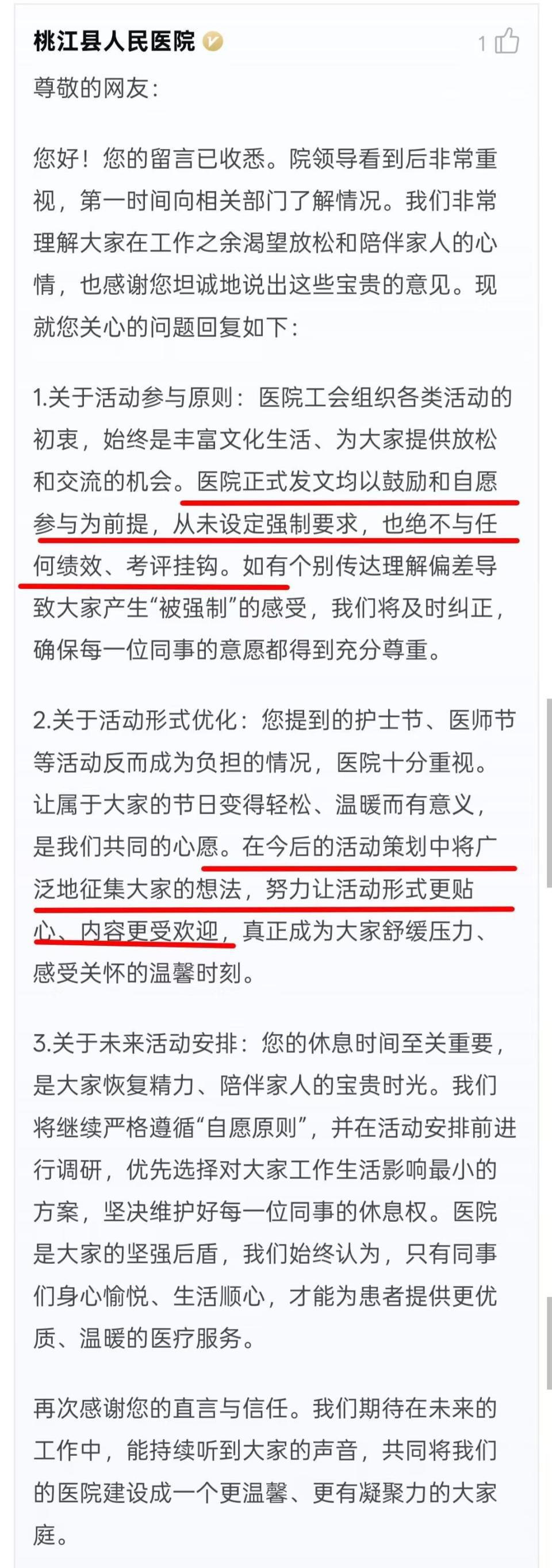 记者看到,在桃江县人民医院针对该投诉的回复中,院方表示,活动均以鼓励和自愿为前提,从未设定强制要求,也绝不与任何绩效、考评挂钩。今后将在活动策划中广泛征集大家的想法,努力让活动形式更贴心、内容更受欢迎。