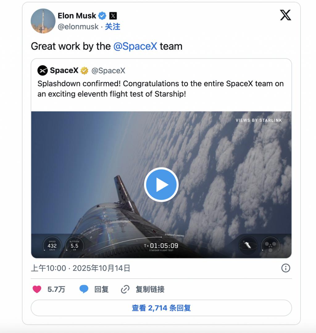 SpaceX 首席执行官埃隆 · 马斯克则在其控制的社交媒体平台 X 上发表了感言,美国有线电视新闻网将其形容为 " 简短而甜蜜 "。