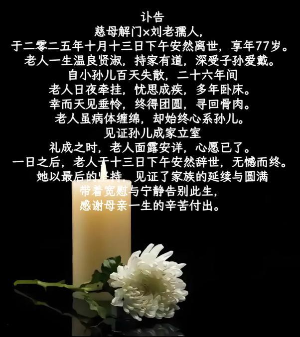 10 月 14 日,河北邢台寻亲家长解克锋在短视频账号上发布讣告,称其母亲于 10 月 13 日下午离世,享年 77 岁。据此前报道,解清锋被拐 25 年的儿子解清帅在 10 月 12 日结婚,与奶奶离世仅差一天。