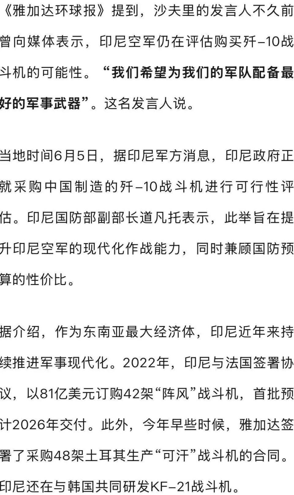 首页 > 综合 印尼防长:将采购中国歼-10战斗机 据印尼安塔拉通讯社、《雅加达环球报》报道,印尼国防部长沙夫里周三(15 日)确认,该国将采购中国歼 -10 战斗机。8 月 15 日,沙夫里抵达雅加达国会大厦(资料图)" 歼 -10 战斗机将很快出现在雅加达 ",沙夫里当天对记者表示。不过,他拒绝透露有关采购的具体时间表或数量等细节。来源:三湘 · 都市报、环球网