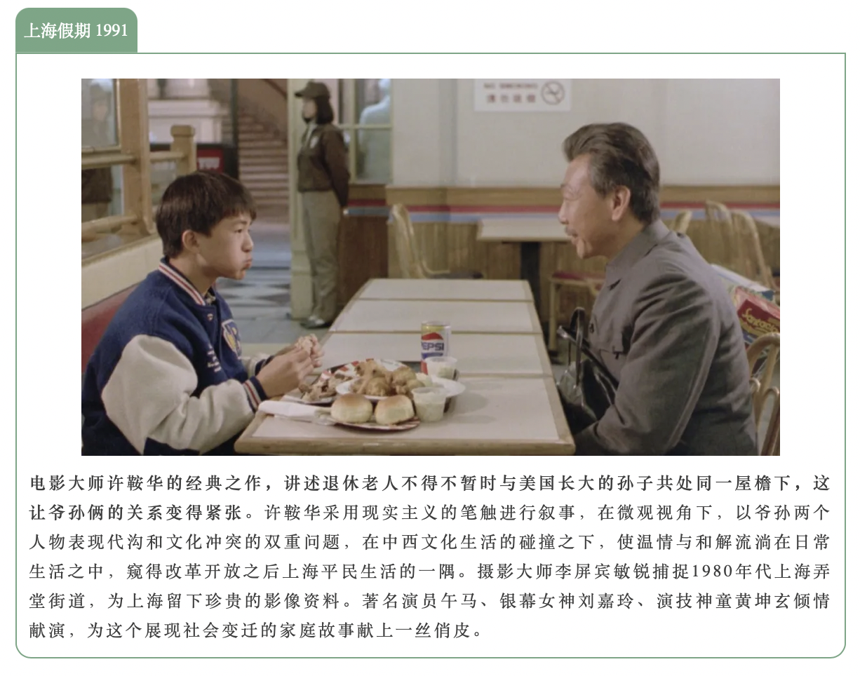 许鞍华导演的《上海假期》(1991)聚焦退休老人与美国长大的孙子在上海弄堂的“磨合日常”,通过爷孙矛盾的化解,细腻呈现中西文化碰撞下的代际沟通与城市烟火气。摄影大师李屏宾镜头下的二十世纪80年代上海弄堂街道,为观众留存珍贵的城市影像记忆。