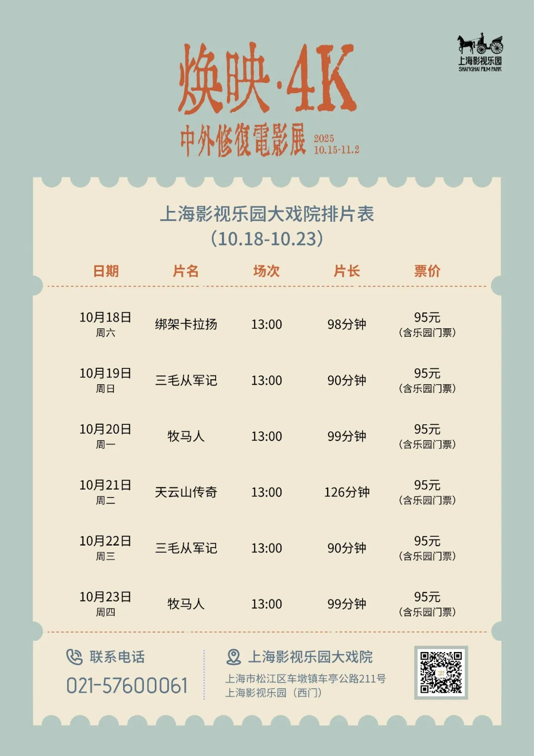 10月16日,由上影集团指导,上海电影技术厂主办的“焕映·4K”中外修复电影展中的国片单元正式开票。《绑架卡拉扬》《上海假期》《三毛从军记》《天云山传奇》《牧马人》等5部经过精心修复的经典国产影片,将结合电影修复技术展览、胶片放映、深度讲座及行业论坛等活动,为观众开启一场“可触摸的电影艺术之旅”, 让经典影片不止于“被记住”,更能“被看见”“被感受”。