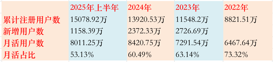 2022年至2025年上半年,企查查各渠道平均月活跃用户数分别为6467.64万、7291.54万、8420.75万和8011.25万,占累计用户数比例从73.32%逐步下降至53.13%。这一变化表明,尽管用户总量在增长,但用户的活跃程度和参与度有所降低。