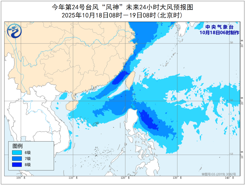 大风预报:受冷空气和“风神”的共同影响,18日08时至19日08时,台湾海峡、巴士海峡、南海北部将有6-8级、阵风9-10级的大风。