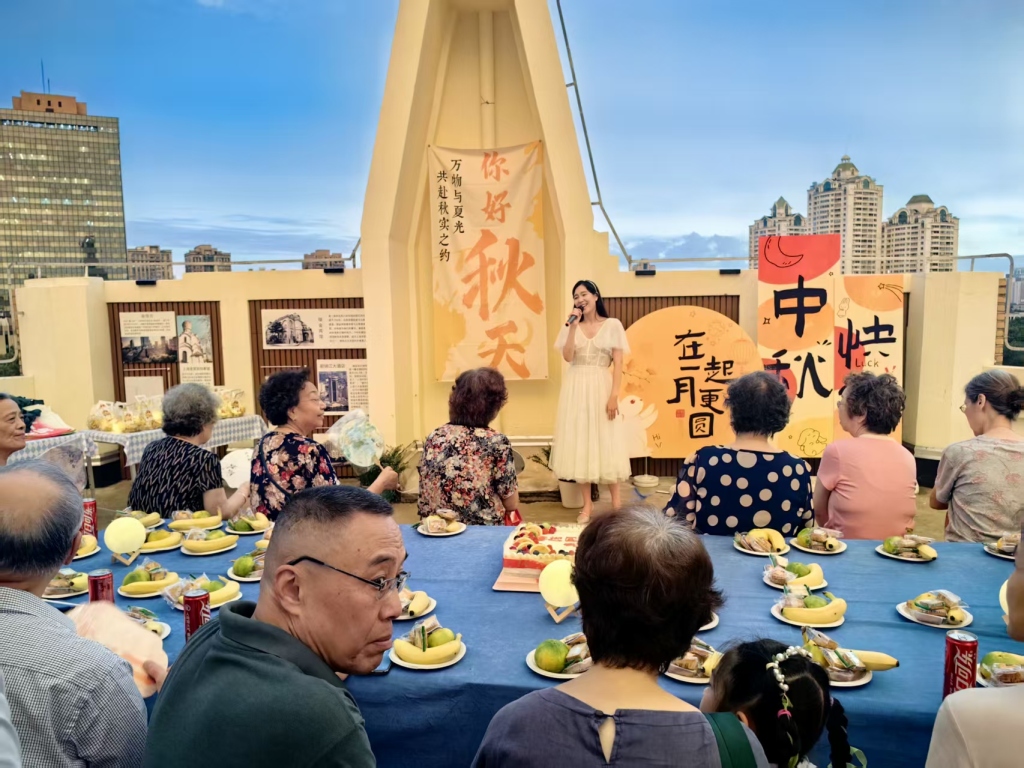 原本漏水并被杂物占据的南昌大楼屋顶天台,改造后已成为屋顶花园+居民会客厅,刚刚过去的中秋,居民在此举办联谊会。图片来源:南昌居民委员会