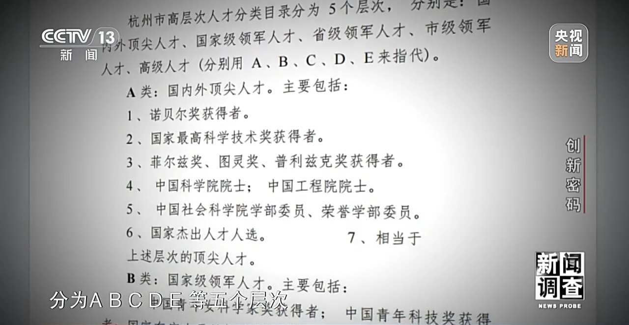 杭州市高层次人才分类目录分为 A、B、C、D、E 等五个层次,分别是: 国内外顶尖人才、国家级领军人才、省级领军人才、市级领军人才、高级人才。